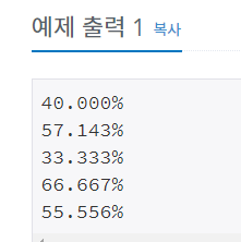 f string 방식에서 소수점 출력에 조건을 주어야 한다.소수점 출력 방식 {x:.3f} 를 f string 방식으로 아래와 같이 써줄 수 있다.print(f'{x:.3f}%')