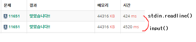 # stdin.readline() 걸린시간 : 424ms 약 10배 빠름;;