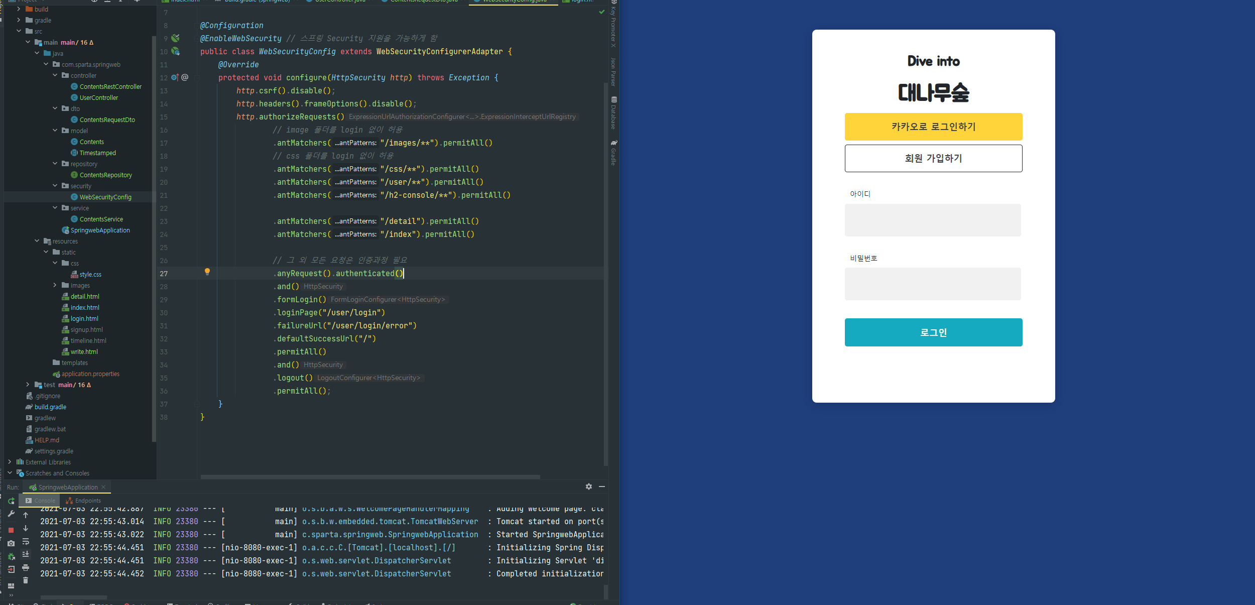 - spring 심화 과정 과제를 시작했다. 기본 과정 과제에 기능을 추가하는 식으로 진행 할 계획이다. security 관련 내용에 대해 더 많은 공부가 필요하다. 특히, 인가와 암호와 관련 내용.