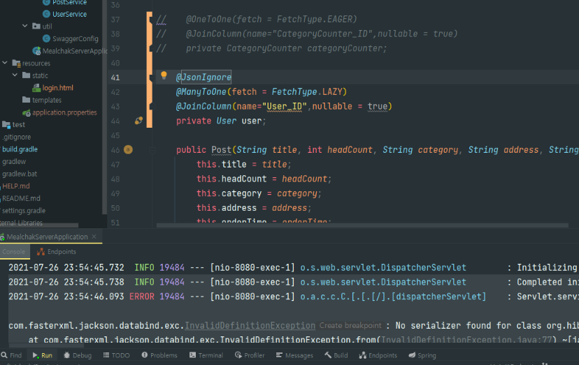 2021-07-26 23:54:46.093 ERROR 19484 --- [nio-8080-exec-1] o.a.c.c.C.[.[.[/].[dispatcherServlet] : Servlet.service() for servlet [dispatcherServlet] in context with path [] threw exception [Request processing failed; nested exception is org.springframework.http.converter.HttpMessageConversionException: Type definition error: [simple type, class org.hibernate.proxy.pojo.bytebuddy.ByteBuddyInterceptor]; nested exception is com.fasterxml.jackson.databind.exc.InvalidDefinitionException: No serializer found for class org.hibernate.proxy.pojo.bytebuddy.ByteBuddyInterceptor and no properties discovered to create BeanSerializer (to avoid exception, disable SerializationFeature.FAIL_ON_EMPTY_BEANS) (through reference chain: java.util.ArrayList[0]->com.mealchak.mealchakserverapplication.model.Post["user"]->com.mealchak.mealchakserverapplication.model.User$HibernateProxy$rNHYH32Z["hibernateLazyInitializer"])] with root cause