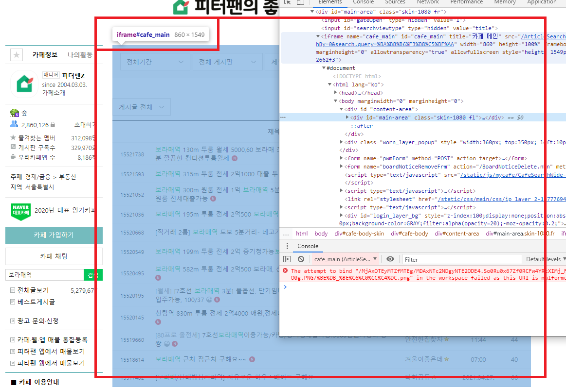 이 부분이 핵심이다. 결과가 나온 게시물들은 iframe 안에 있기 때문에