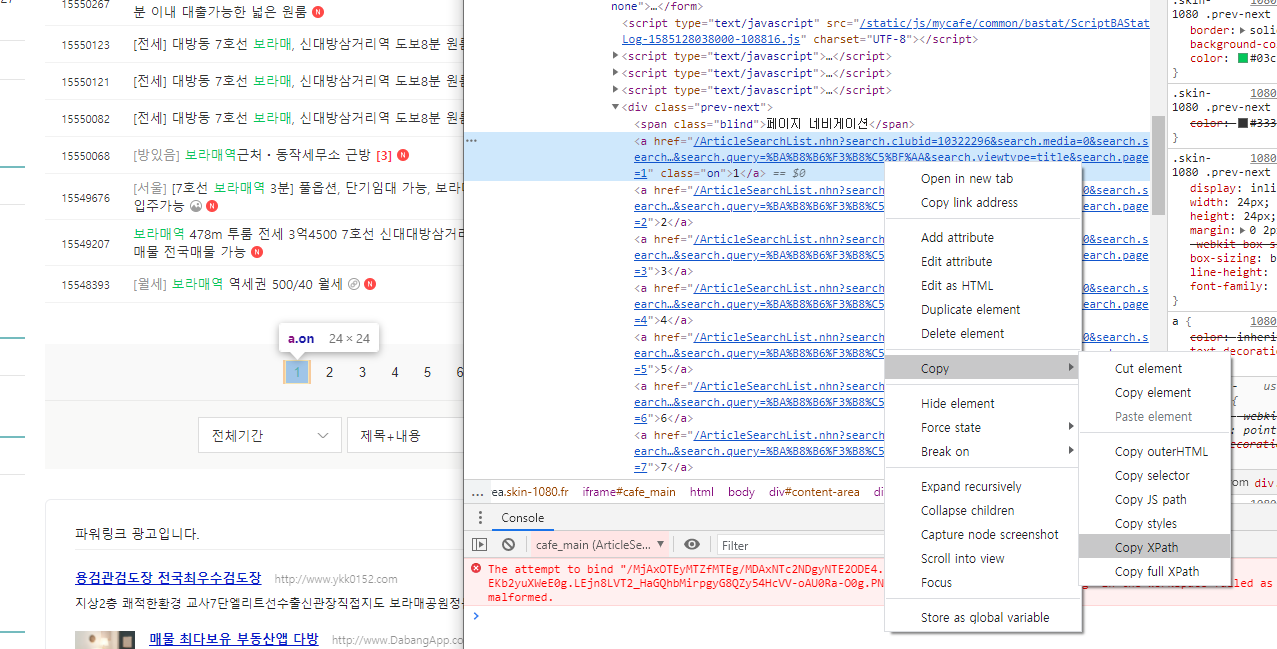 다른 네이버 카페에서는 copyselector 주소가 다르므로