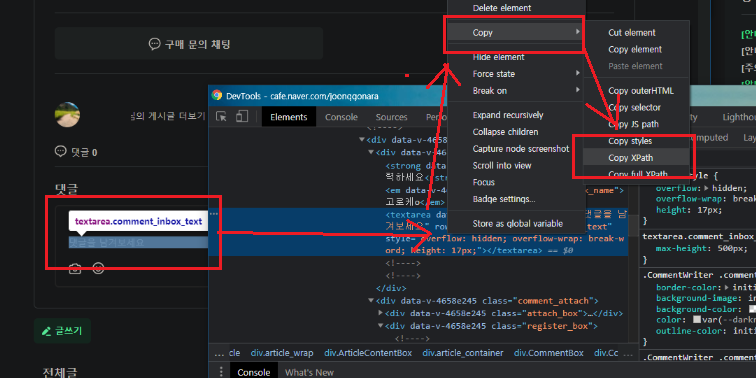 네이버 카페는 로그인이 되고 해당 게시물에 들어갔을 때 댓글창이 보여야 댓글의 xpath를 찾을 수 있다.
