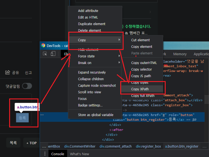 2. 같은 방법으로 등록 버튼의 xpath도 가져옵니다.