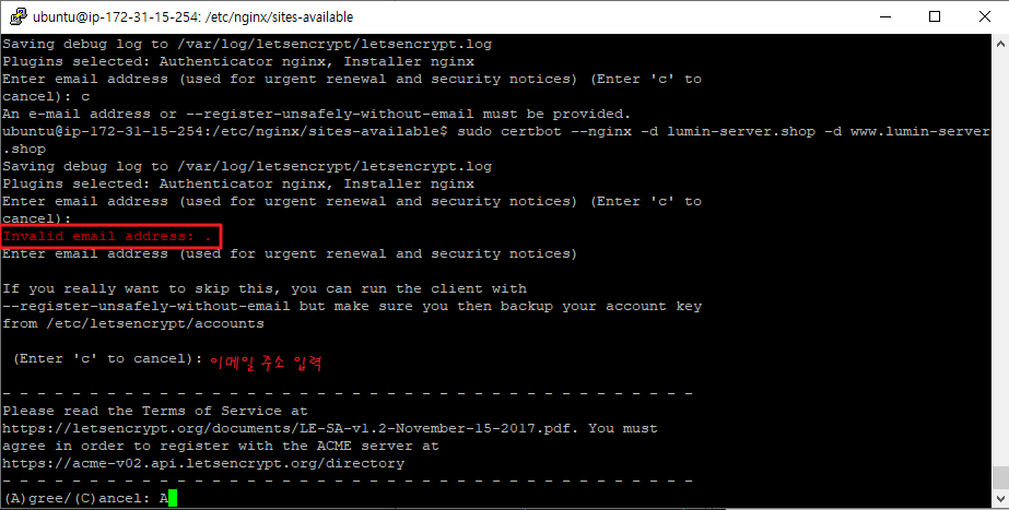 이제 설정한 도메인을 지정해서 Nginx를 통해 인증서를 획득해보자