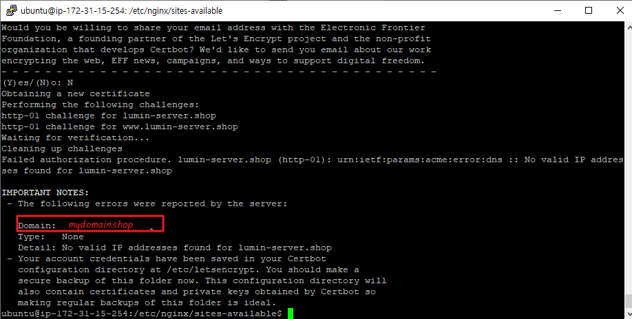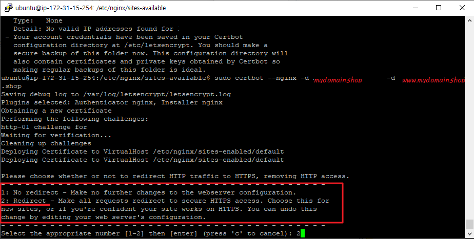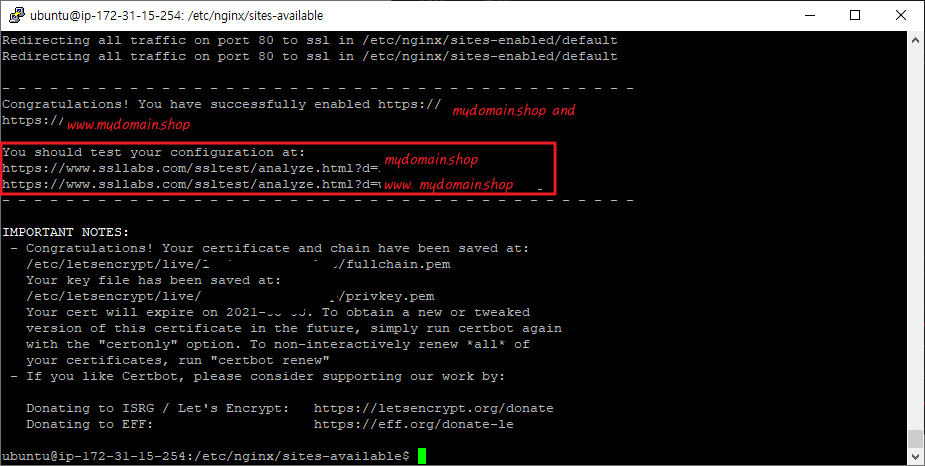 $ sudo certbot --nginx -d mydomain.shop -d www.mydomain.shop