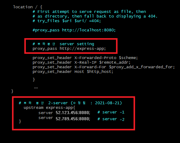 주의 ) upstream 은 server{ } 밖에 적어주어야한다