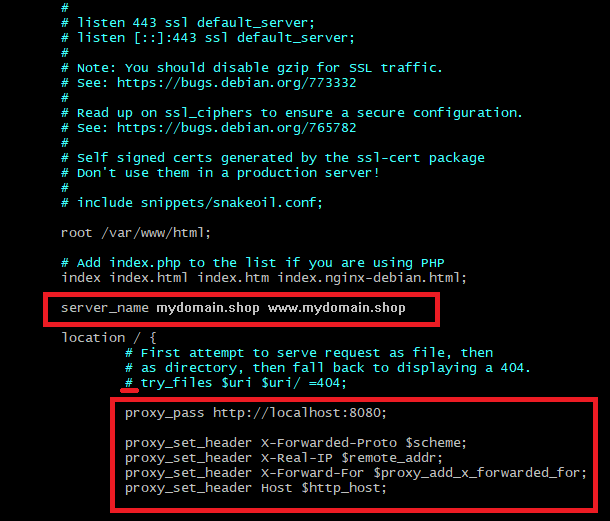 Nginx 기본 설정 파일 인증서 적용할 도메인 이름 설정하기