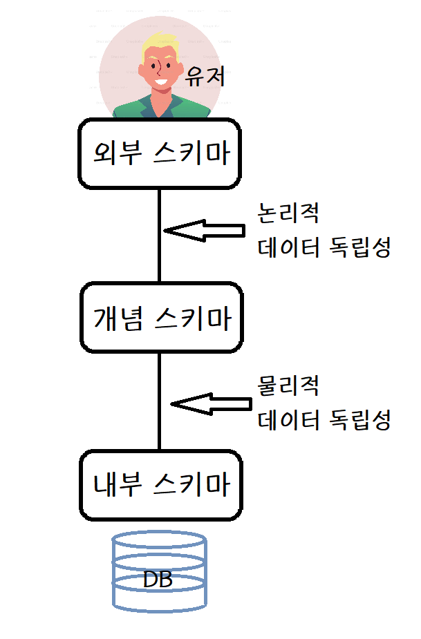 - 외부 스키마 : 사용자 관점, 사용자가 보는, 개인 DB 스키마