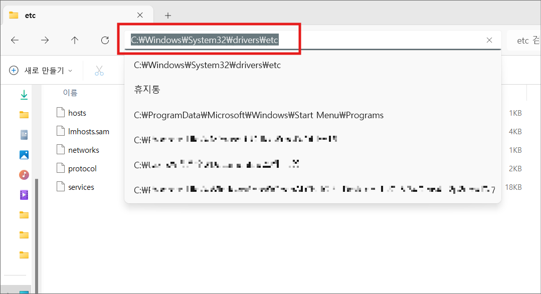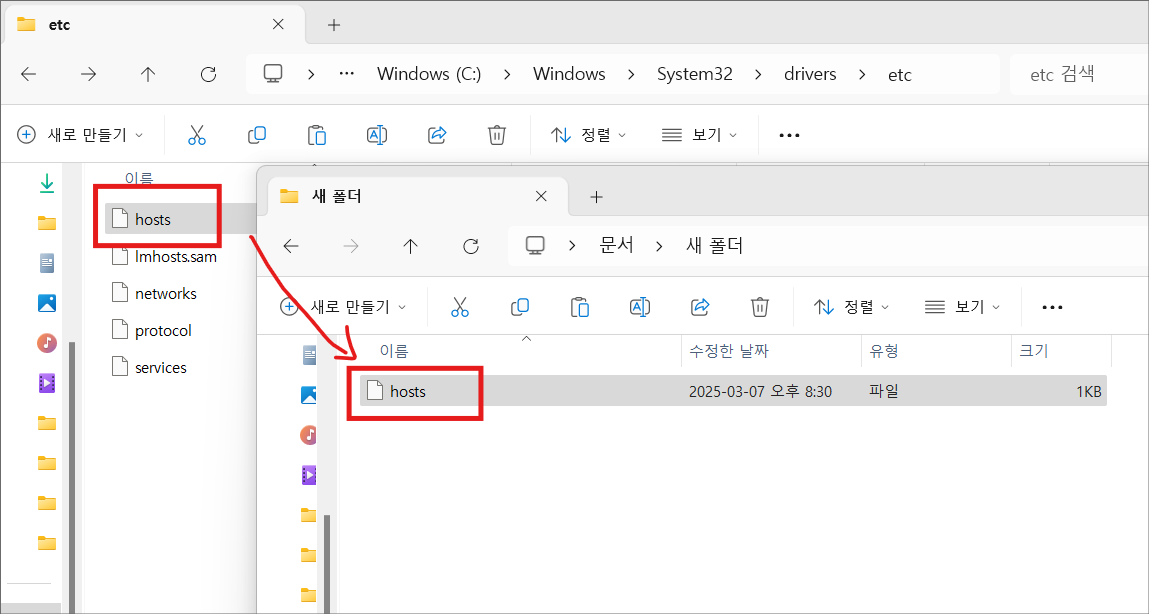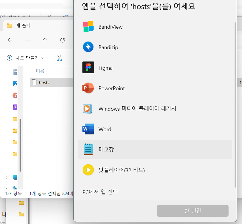3. 복사한 hosts 파일을 더블클릭해서 연결프로그램을 메모장으로 연다.