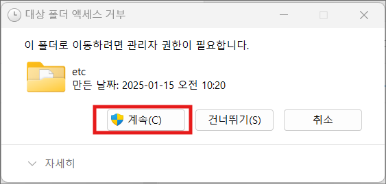 7. 관리자 권한 어쩌구-- '계속' 클릭