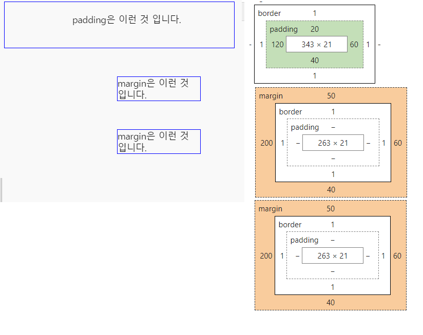 각 요소간의 보더 간격을 margin , 보더와 요소와의 간격을 padding 이라고 한다.
