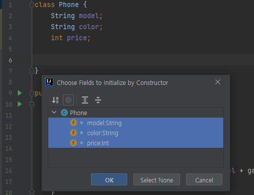 "단축키 Alt + insert -> constructor -> 전부 선택 -> ok "로 자동 생성 가능